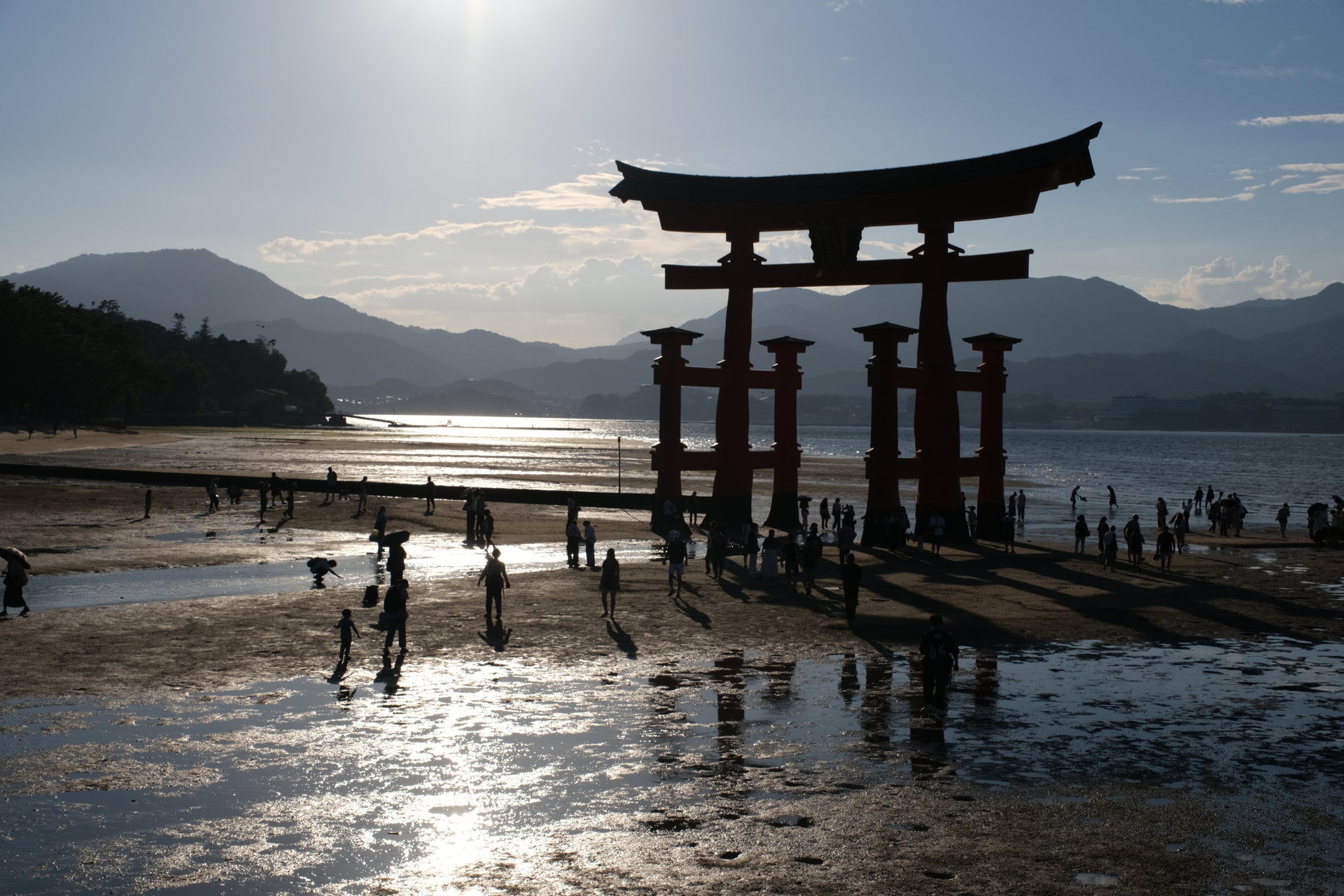 お? 潮が引いてる? いいねえ、厳島神社の大鳥居の近くまで歩けそうですよ。