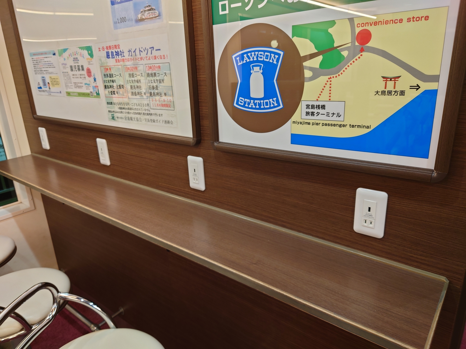 宮島桟橋旅客ターミナルの中にあるお土産屋や厳島神社、宮島ロープウェーなど数ある名所などを差し置いて、なぜかローソンの場所が案内されているのが謎でした。
