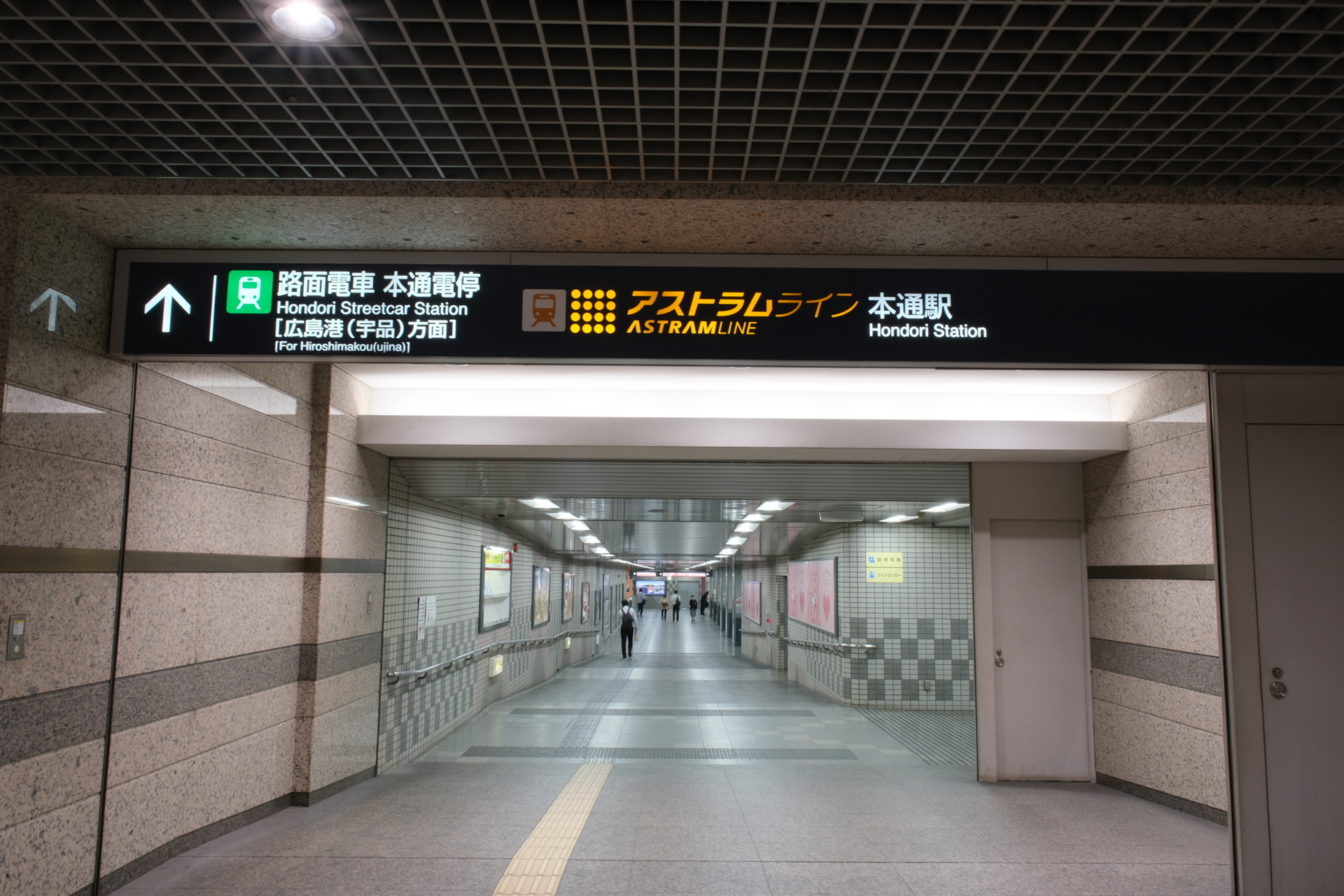 まず初めに広電で紙屋町東電停に向かいました。路面電車しかないから地上アクセスかなと思ったら、地下街があるんですね。