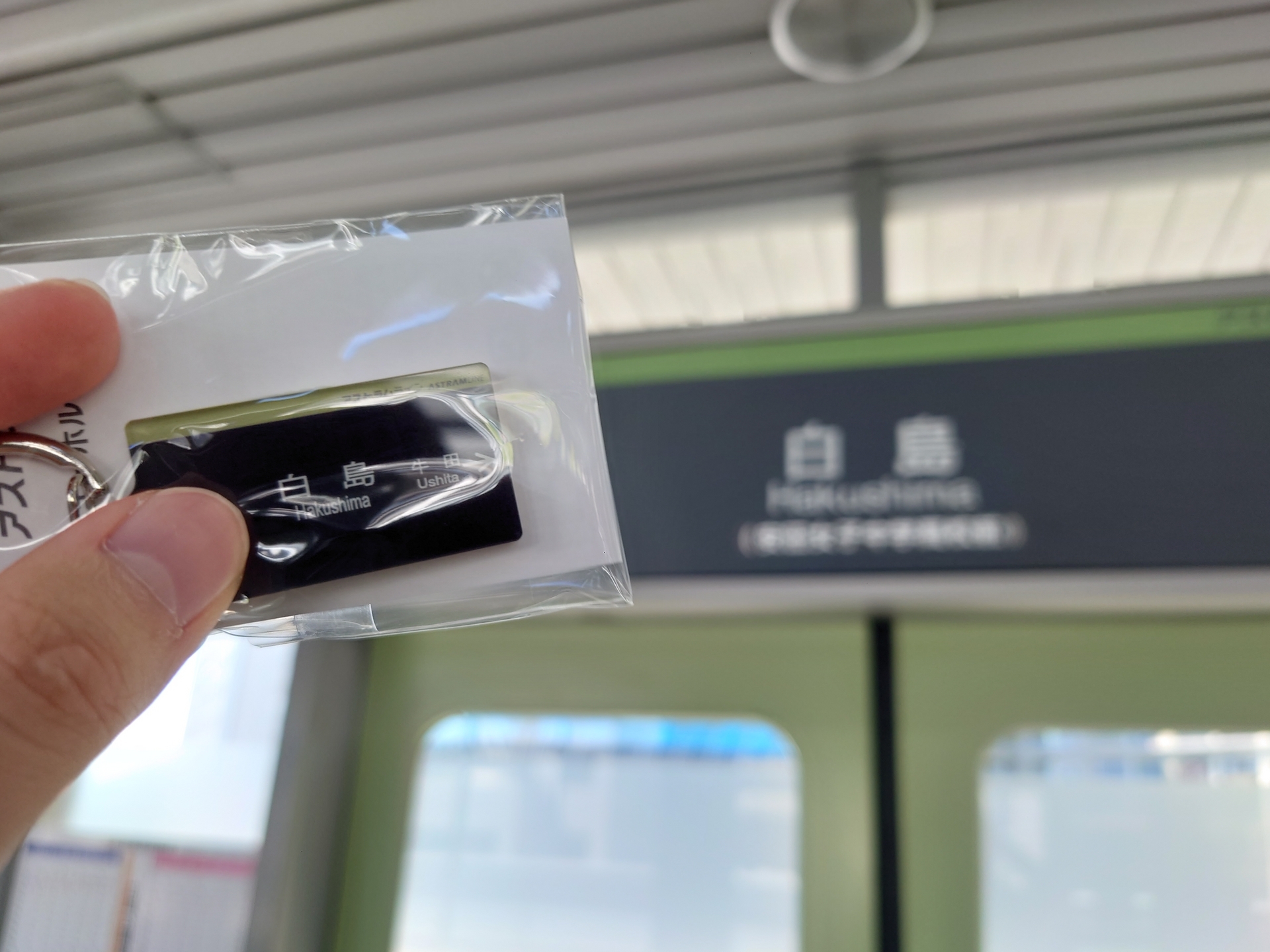 平和記念公園の観光に時間を使用したため、終点まで乗ることはせず、白島駅まで乗車しました。本通駅で買っておいたキーホルダーの中身が白島駅だったので、白島駅で記念撮影。