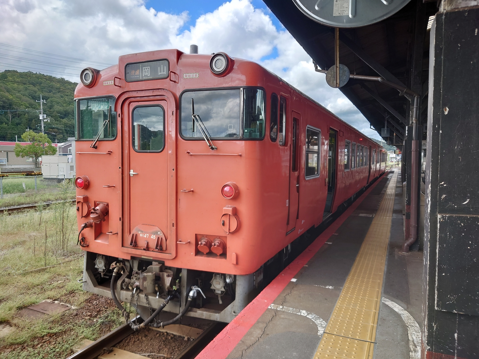 岡山からは少し時間があったので、駅前を観光。桃太郎像や岡電を見つつ、津山線ホームに向かいます。