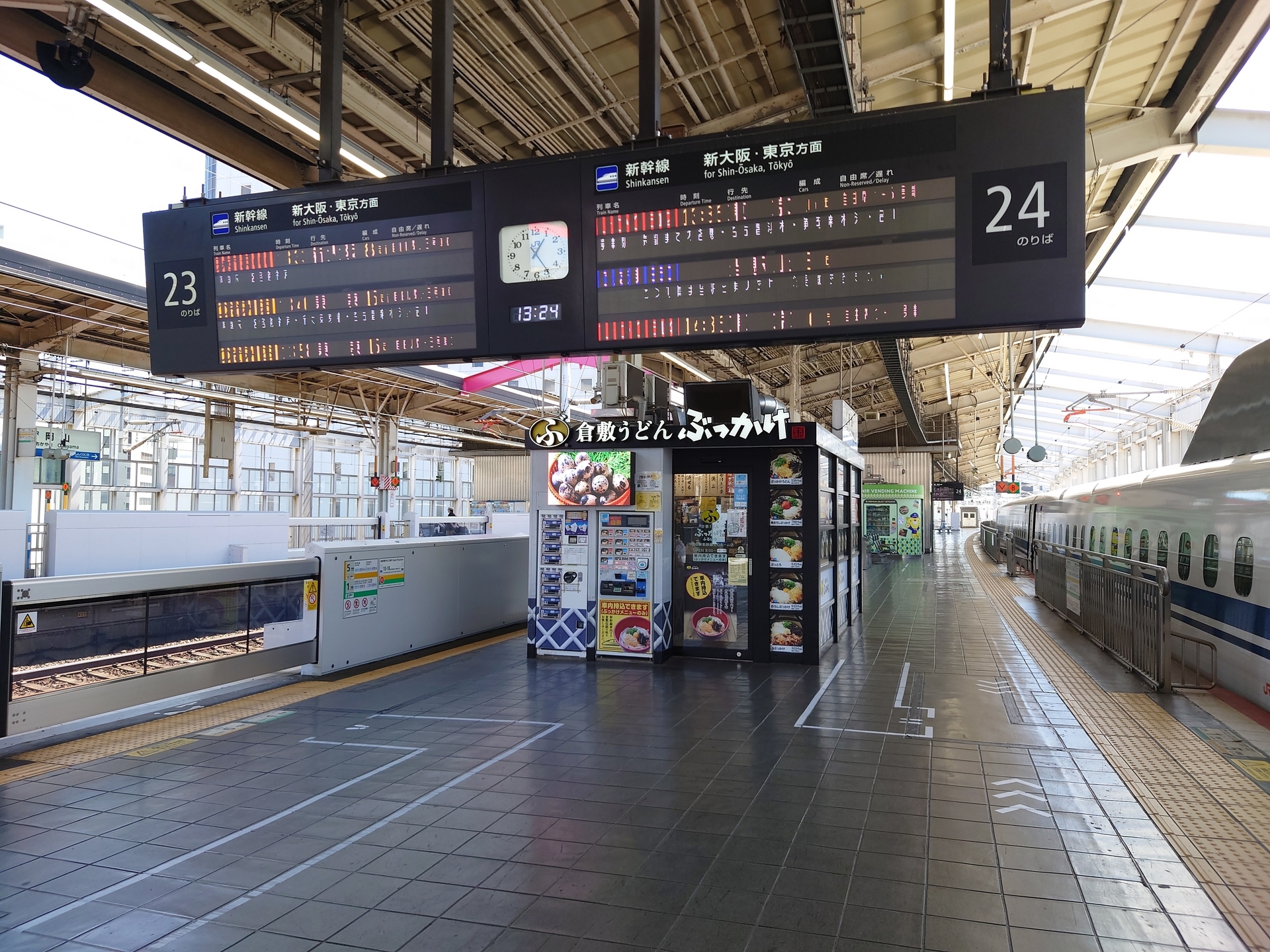 元々は1時間早いさくら550号に乗るつもりでしたが、お土産ついでに買う時間はないなと思い、1時間遅らせることに。岡山駅では1時間弱あったので新幹線ホームの倉敷そばで昼ごはんにしました。お土産もここで追加で買いました。それでも時間が余っていたので、新幹線改札を通る前は「227系見えないかな・・・」とか「なんか珍しいやくも号来ないかな・・・」とか、岡山駅構内であれこれ歩き回っていました。