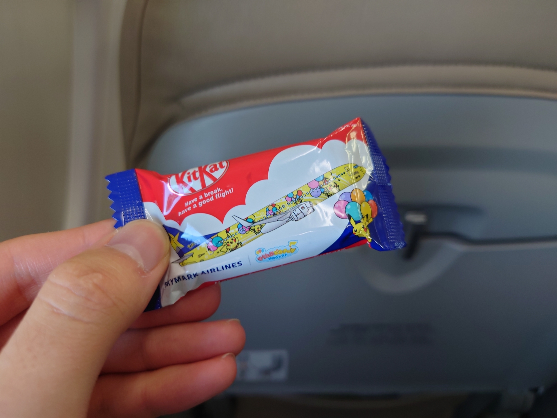 スカイマークのサービスとして、ジュースとお菓子(キットカット)がプレゼントされます。小腹が空いていたところなので助かります。