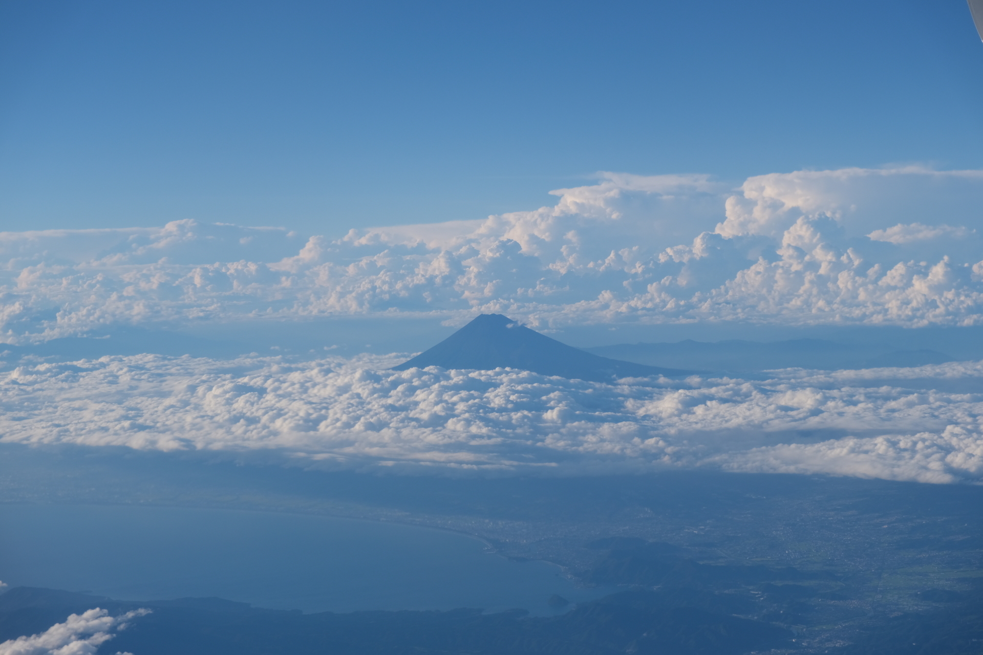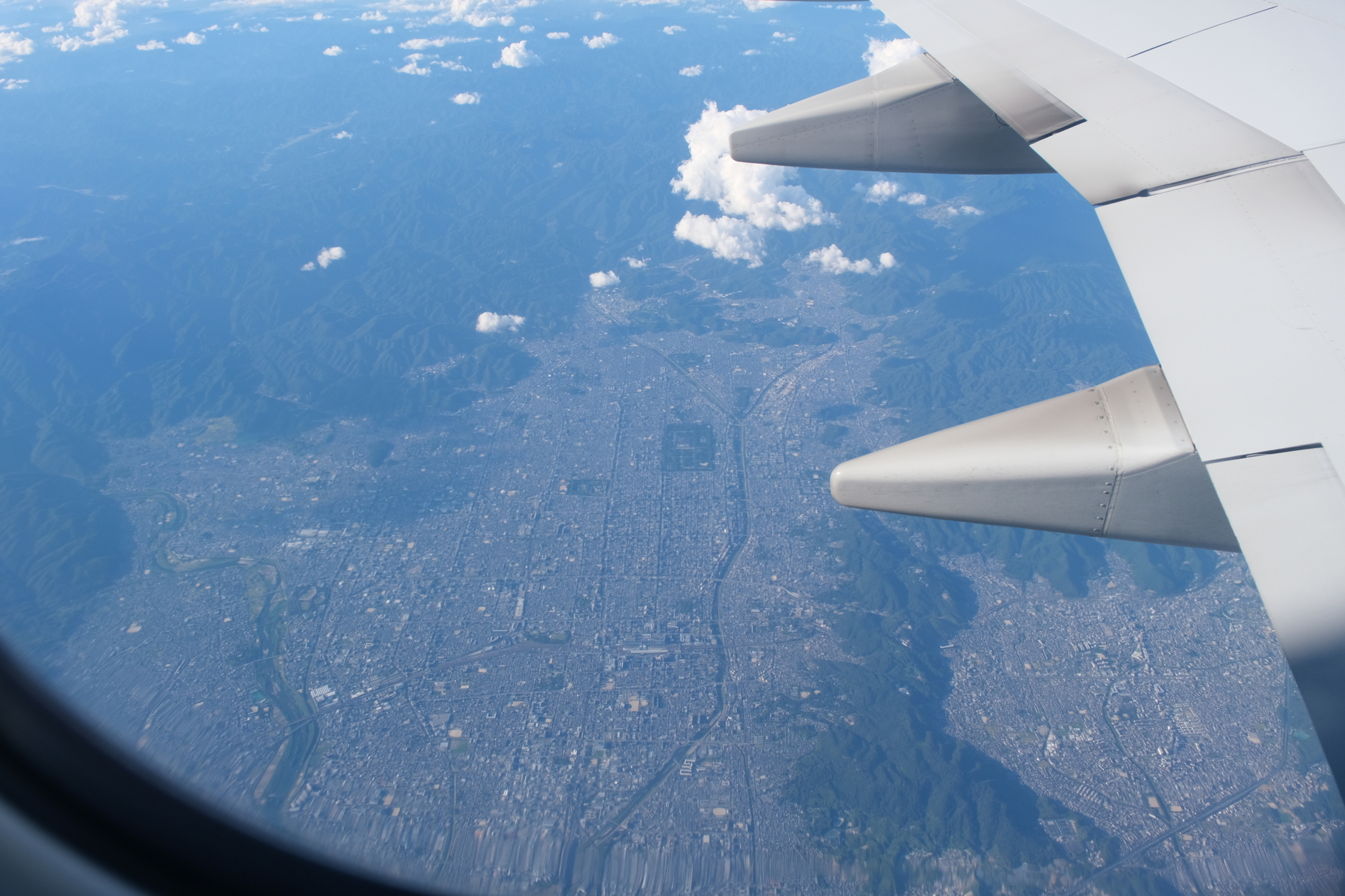 飛行機の醍醐味は空からの景色。「お、これは京都だろ~」とか「新幹線が並走している」とか「あ~今日も富士山は雲で隠れてるか」とか思いながら写真に残しましたが、隣席の人が寝ていたので失礼だったかな・・・。