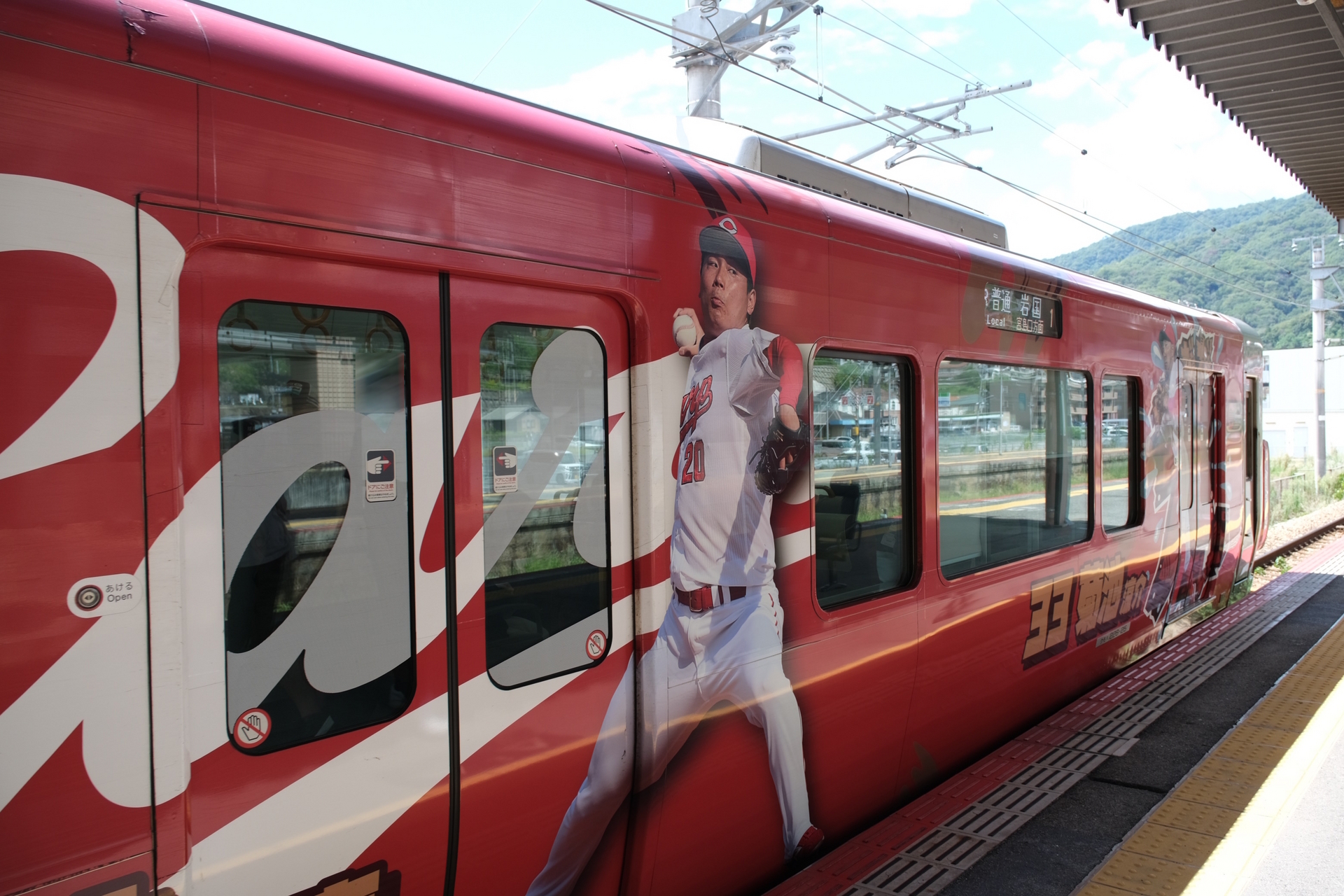 ここから広島駅で来た道を返します。カープラッピングされた列車が来ました。